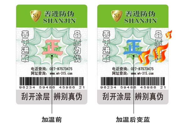 在防偽檢測方面最為簡單、最易操作的納米級材料防偽;鑒別時(shí)只需標(biāo)識上溫度達(dá)到(如:打火機(jī)考圖案部位),圖案即消失或變色,溫度恢復(fù)后,圖案自然恢復(fù),具有可逆性,是國內(nèi)先進(jìn)的防偽技術(shù)。